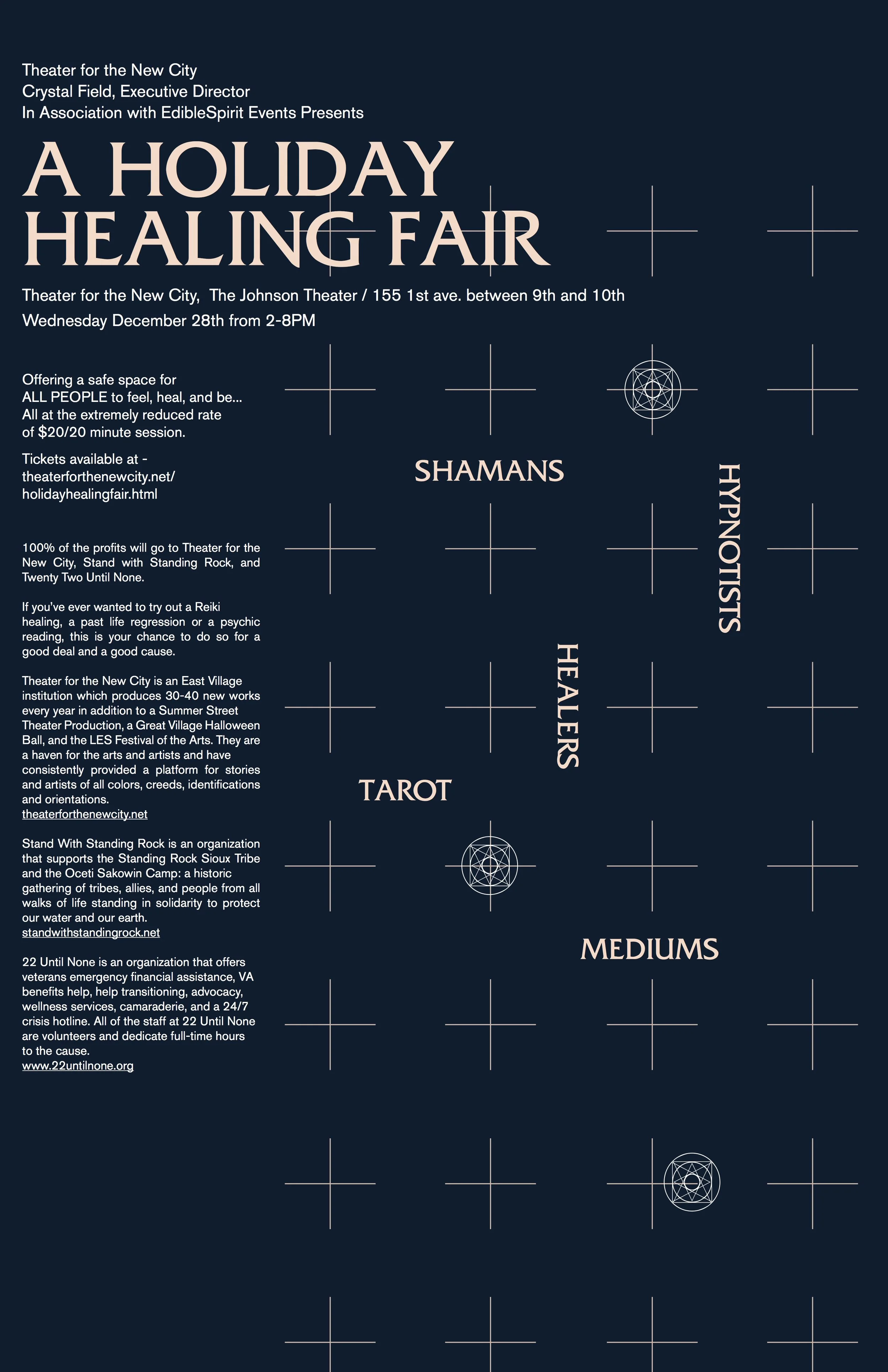 We will have a skilled group of healers, mediums, readers, shamans and hypnotists offering their services at the extremely reduced rate of $20 for a 20 minute session. Advance tickets are available at theaterforthenewcity.net.